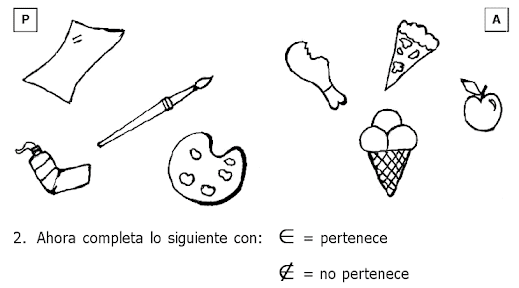 3. Encierra con color rojo al conjunto "P", de objetos de pintura; y con color azul, al conjunto "A" de alimentos